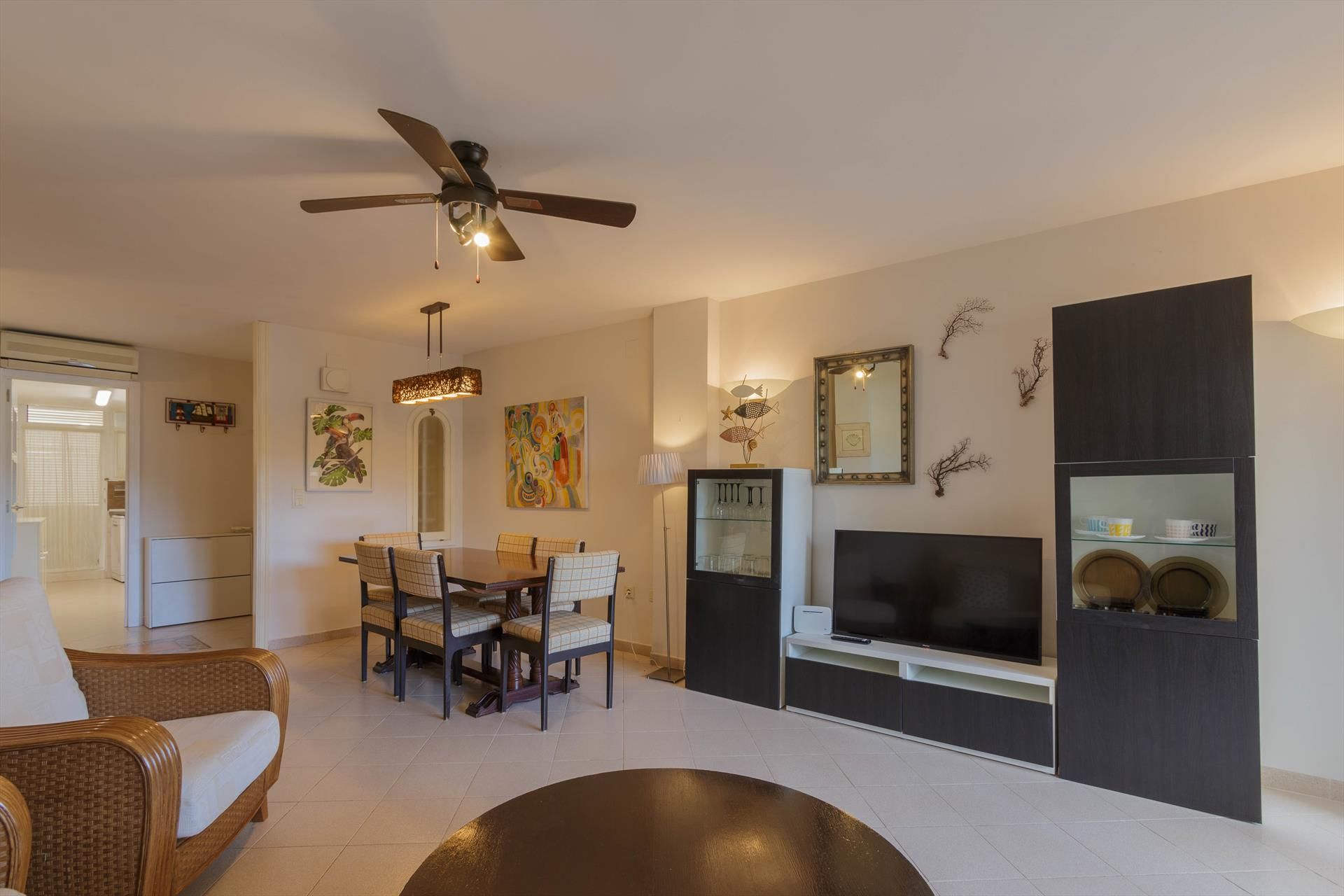Das Wohn-/Esszimmer hat einen Smart TV mit Wifi, Klimaanlage und Deckenventilator.