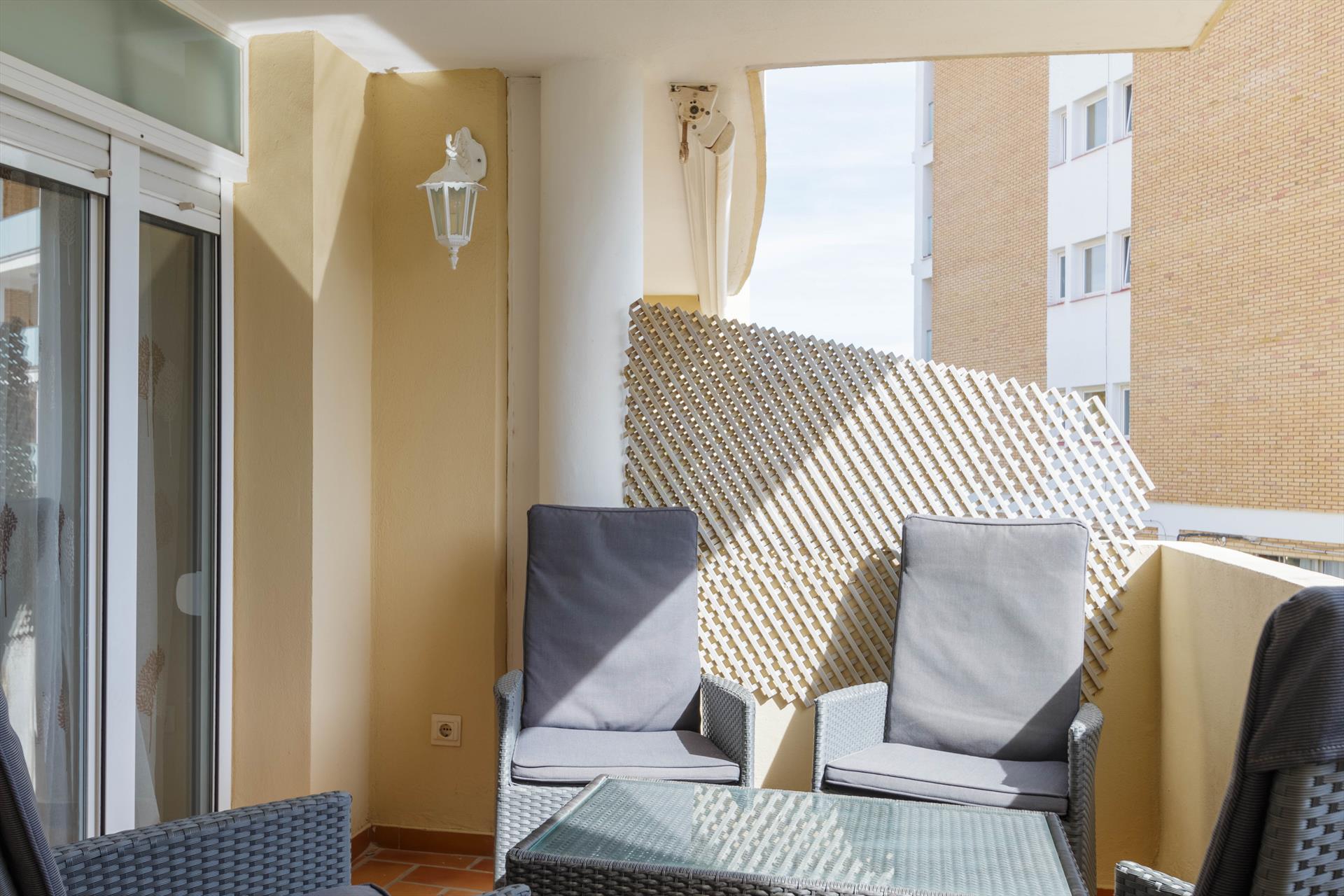 Die Terrasse ist mit Gartenmöbeln ausgestattet, von der aus man den Strand von Arenal und das Meer sehen kann.